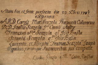 si è notato una preziosa iscrizione con data e firma dell'autore e della famiglia che avevano come patronato l'altare omonimo cioè Scazola.